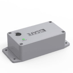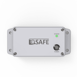 A ruggedised tilt sensor enclosure branded QSafe, designed for structural monitoring and safety applications in outdoor and industrial environments. The sealed grey ABS enclosure features a flanged four-point mounting base for secure attachment to poles, walls, and structural members. A front-panel power button and green status LED provide quick field diagnostics without requiring a connected display. The IP-rated construction ensures reliable operation in rain, dust, and temperature extremes.