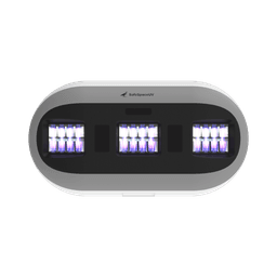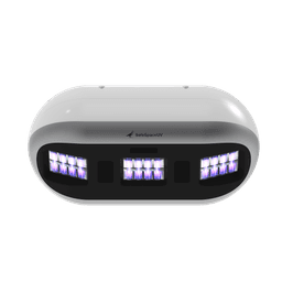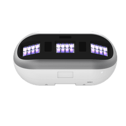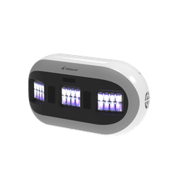 A wall-mounted UV disinfection system branded SafeSpaceUV, engineered for continuous air and surface sanitisation in healthcare, commercial, and public environments. The enclosure houses a triple UV-C lamp array behind sealed optical windows, delivering broad-area coverage while containing UV radiation safely. The two-tone white and silver finish blends into modern interiors, while the wall-mount design keeps floor space free and positions the unit at optimal height for effective disinfection.